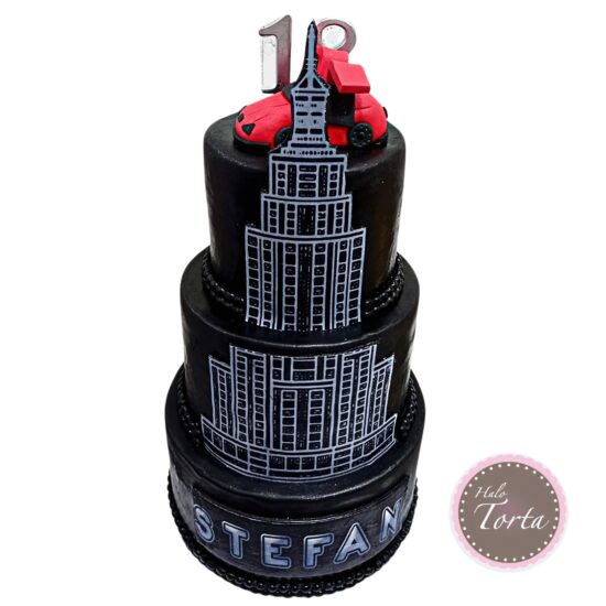Crna torta sa zgradama i Lamborghinijem za 18. rođendan