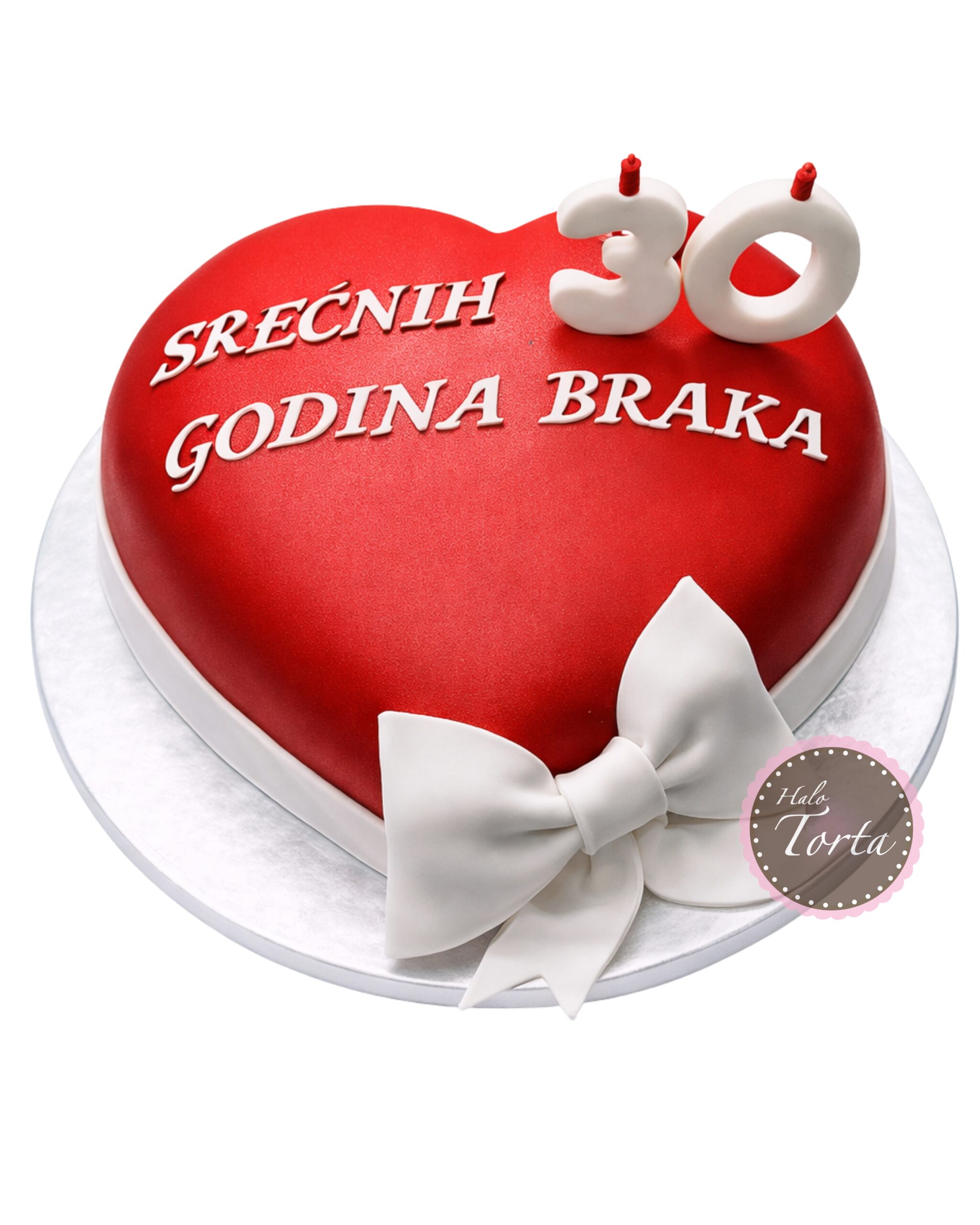 Klasična crvena torta u obliku srca sa belom mašnom i svečanim natpisom povodom godišnjice braka. Elegantna i romantična, idealna za obeležavanje važnih ljubavnih jubileja.